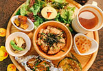 A 畑の見えるランチプレート、B たけのことアスパラのクリームパスタ、C カフェ風ぶた丼