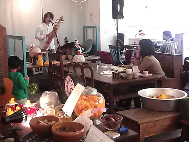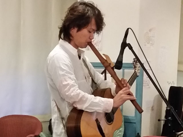 丸山茂樹さんはアコースティックギター、三線、トンコリ、ネイティブアメリカンフルート、ブズーキなど様々な楽器と声で、日本全国内・世界各地へ旅をし、出会いを大切に人・自然・思いを表現されている演奏家です。アップの写真で丸山さんが吹いている縦笛のような楽器は「ネイティブアメリカンフルート」と言って日本で所有しているのは3人だけと言うとても珍しい楽器なのです。