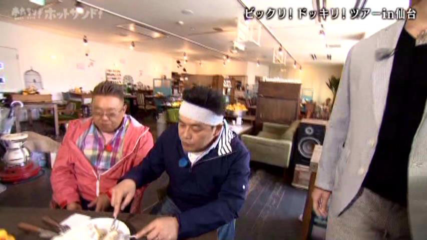 お二が訪れたのは、女性に絶対的に人気を誇るカフェ「パンプルムゥス」。店内に入ると店長がさっそくお出迎え。伊達さんに握手を求めた店長の手がポロリと取れて床に転がり、思わずビックリ。そんな先制攻撃を受けるも、お二人は店内に100個以上も置かれているアヒルグッズを見つけて「アッ、アヒルがいっぱいいる」「かわいいね」と、とっても楽しそう。そこに運ばれてきたのが「いちご&バナナ&マウンテンクリーム」のパンケーキ。「うわ~なんだこれ~」と富澤さん。伊達さんはマウンテンクリームの大きさに「すげ~なこれ」と驚きながら「ず~と喰えるよ、これ」と、程よい甘さを気に入ってくださいました。