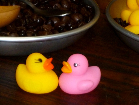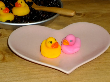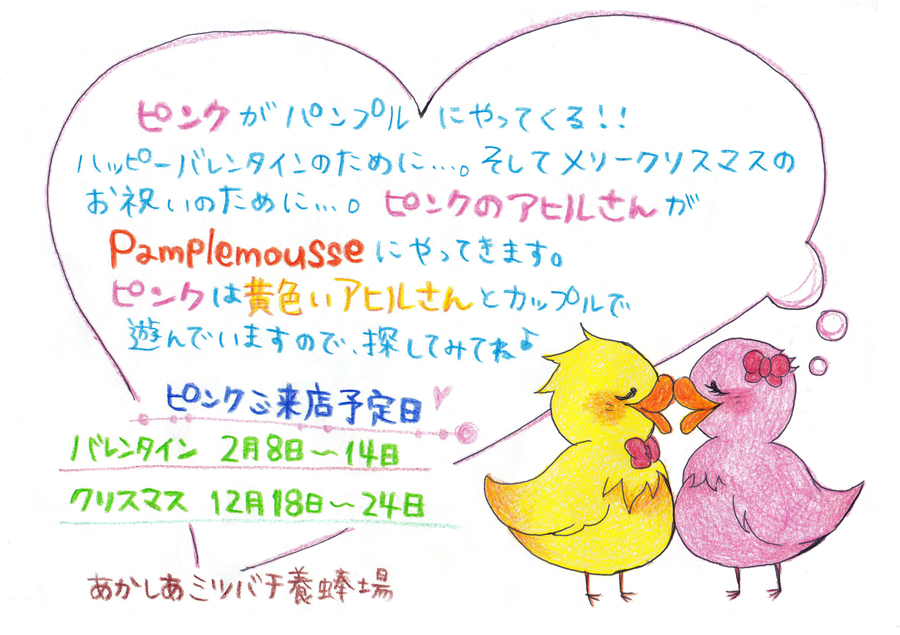 ハッピーバレンタインのために。そしてメリークリスマスのお祝いのために。ピンクのアヒルさんがPamplemousseにやってきます。ピンクは黄色いアヒルさんとカップルで遊んでいますので探してみてね。
